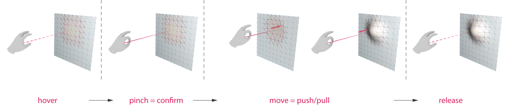 The push/pull deformation is realised by measuring, at each frame, the distance of the hand to the mesh and The push/pull deformation is realised by measuring, at each frame, the distance of the hand to the mesh and comparing it to the previous frame. This operation is achieved by using Unity RaycastHit functions.